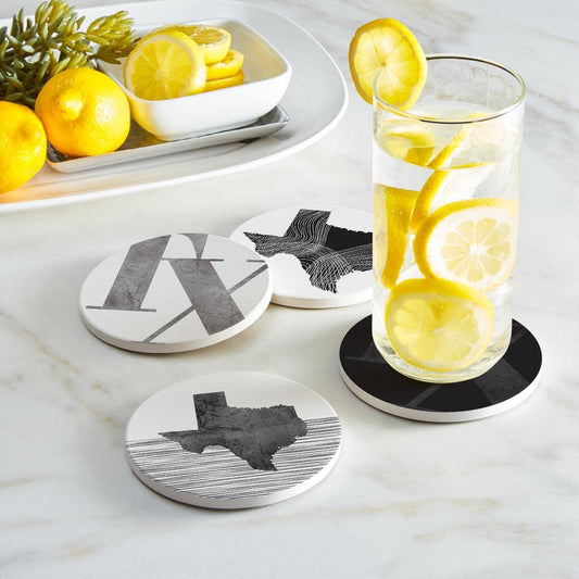 Modern Black & White Texas Set 1, Joyride Home Decor, 4 Ceramic Coasters, 4-inch Circle Drink Coasters, Set of 4, Non-Slip Cork Back, Protects Surfaces, Express Your Style.